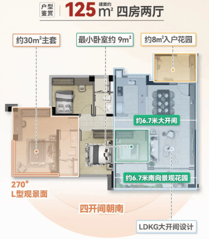 建面约 125㎡的户型,以 4 房 2 卫设计搭配约 8㎡入户花园,功能性十足。房间布局合理,最小房间约 9㎡,实现空间平权。主卧近 4 米南向大开间,270°L 型观景面,搭配步入式衣帽间,舒适与实用兼具。该户型还实现四开间朝南和南北双阳台设计,约 6.7 米南向景观花园,约 11㎡的空间为生活增添更多诗意场景。