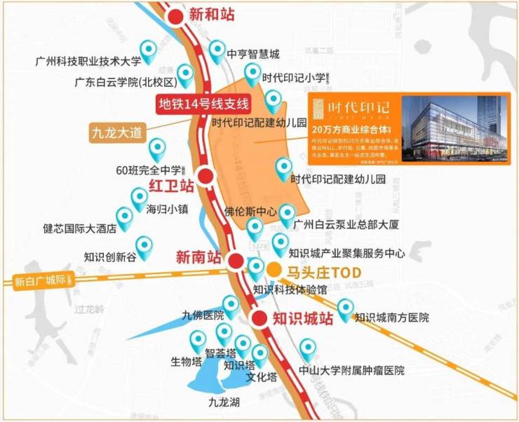 时代印记傲踞中新知识城发展主轴,紧邻地铁14号线支线红卫站,真正实现“出家门即入地铁口”的便捷通勤体验。搭乘14号线支线,仅1站即可抵达白云新和,2站直达嘉禾望岗枢纽;换乘21号线,轻松畅达天河员村CBD,高效连接城市核心资源。更令人期待的是,项目所在区域正加速打造集高铁、地铁、城际轨道于一体的超大型TOD综合交通枢纽。未来通过穗莞深-新白广广佛环线等高速轨道交通,可快速通达广州东站、南沙港乃至白云机场与深圳机场,真正实现“湾区1小时生活圈”。