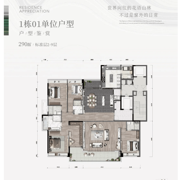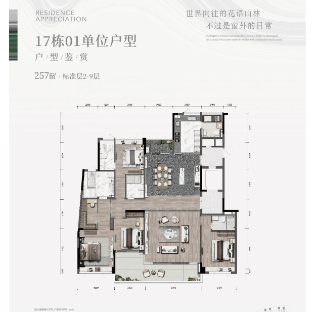 合景臻颐府目前的在售房源主要集中在建面约二百六十至三百五十平方米的巨幕畔山大平层,以及建面约二百三十五至二百七十三平方米的南北双庭院院墅。这些户型设计充分体现了“以阔换奢”的理念,起步面积即达两百平方米以上,在天河区在售住宅中极为罕见。所有楼栋均为六至十一层的低密度建筑,保证了每一户业主都能享受到同等的私密性和景观资源。