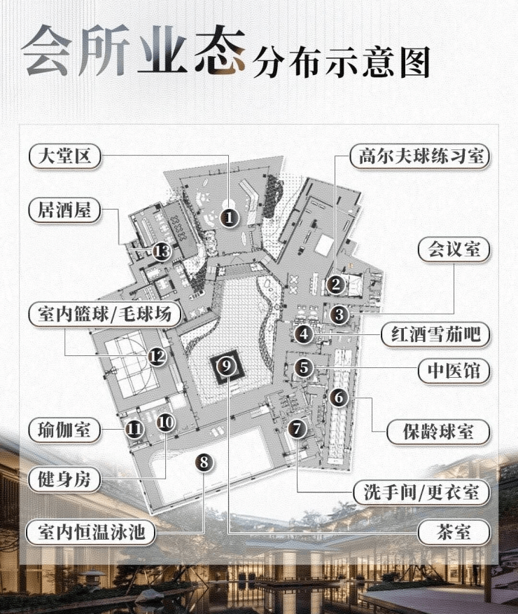 项目的主景观区设有一座下沉式庭院和一个面积约二千五百平方米的会所——臻庭。会所包含地上、地面、地下三层空间,功能分区明确,设施齐全。既有常见的恒温泳池、健身房、普拉提室等运动休闲设施,也有红酒雪茄吧、保龄球馆、室内篮球羽球混合馆、高尔夫练习室等圈层专属配套,基本能满足业主的日常娱乐和社交需求。会所的设计注重横向展开和纵向展开的结合,造就了更立体多变的景致,为业主提供了丰富的活动空间。