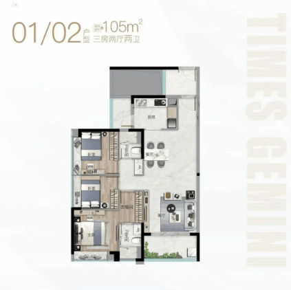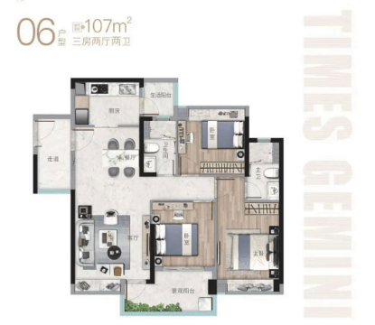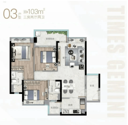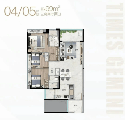 建面约99-107㎡奢装三房,则主要面向三口之家或改善型置业者,户型灵动阔绰,布局方正,南北通透,采光和通风效果极佳。客厅宽敞明亮,能够满足家庭聚会、休闲娱乐等需求;卧室空间充足,配备独立卫生间和衣帽间,提升业主的居住舒适度;阳台宽敞,视野开阔,能够俯瞰社区园林美景,同时兼顾晾晒功能。该户型同样配备国际品牌装修,装修标准高达2500元/㎡,采用的装修品牌均为行业内的知名品牌,包括科勒、方太、美的等,不仅品质有保障,还能为业主打造高端、舒适的居住环境。