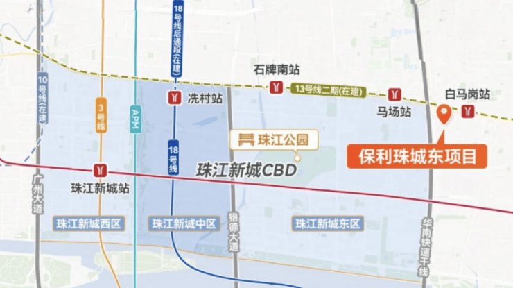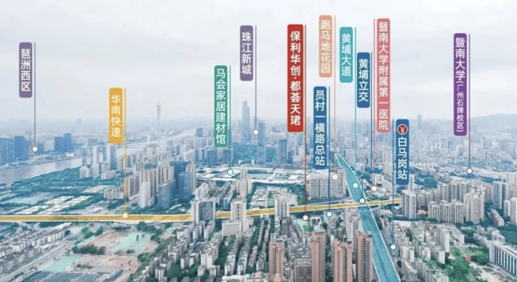 项目地块紧邻华南快速和黄埔大道交汇处,西侧为珠江新城东区,东侧为金融城核心区,南面为珠江和琶洲西区。地铁13、21号线环绕,未来白马岗地铁站在建,通勤便利。快速路和主干道直连各核心板块,为业主提供高效交通体系。