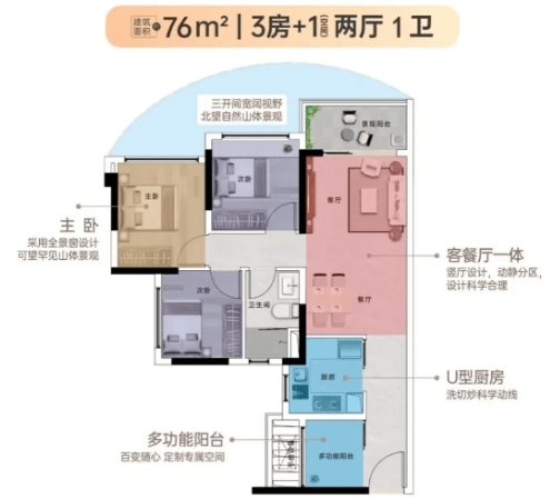 户型设计:76㎡3+1 房,空间紧凑实用,零飘窗设计,可利用空间最大化,满足三口之家基础居住需求;88㎡3+1 房,南北对流,采光通风佳,双卫设计,适配多人口家庭,避免早晚高峰 “抢卫生间” 问题;119㎡改善户型,空间阔绰,功能分区明确,适合追求居住舒适度的刚需升级家庭;所有户型均为 N+1 灵动设计,可根据需求将 “+1” 空间改造为书房、儿童房或储物间,实用性强。