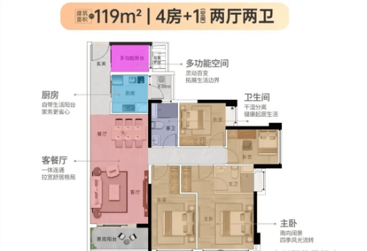 户型:76㎡3+1 房、88㎡3+1 房(南北对流)、119㎡改善户型,均为 N+1 灵动设计,零飘窗,空间利用率超 90%。