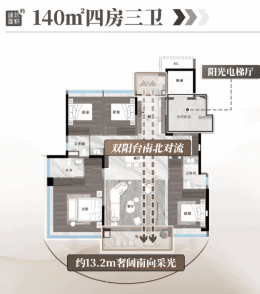 ### 2. 140-143㎡四房:双主套热门户型,适配多孩家庭