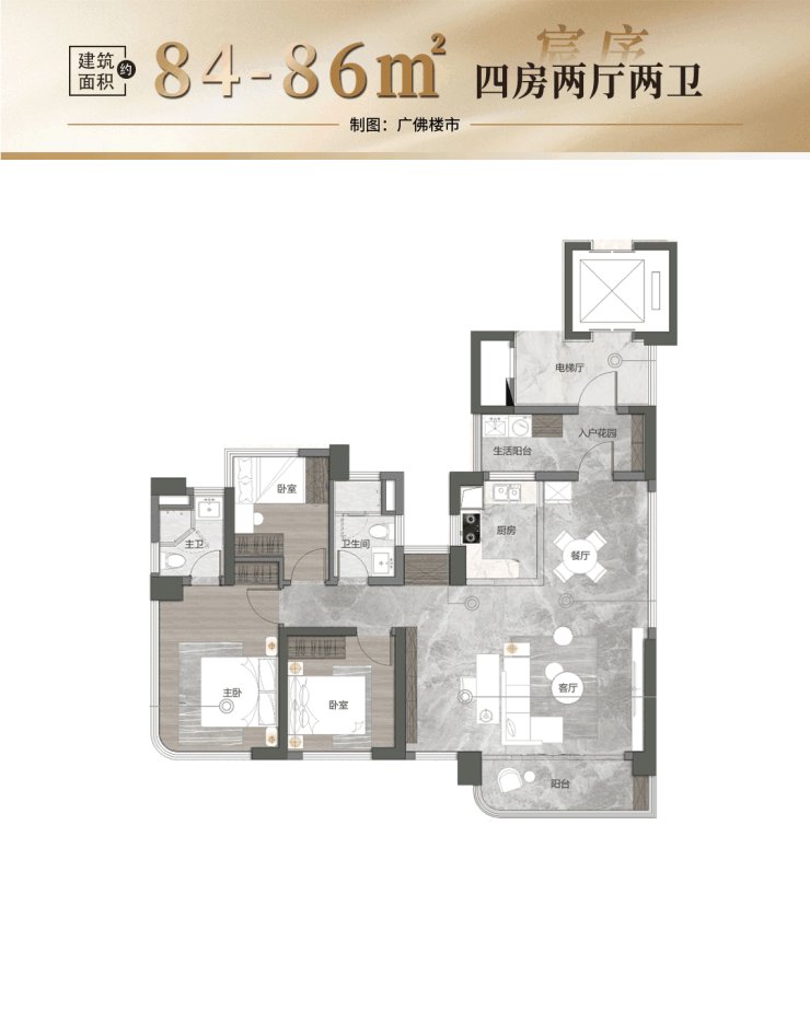 84㎡户型:南向布局,四房+独立电梯厅配置,实际使用面积达126㎡,折算单价仅约2.6万/㎡。