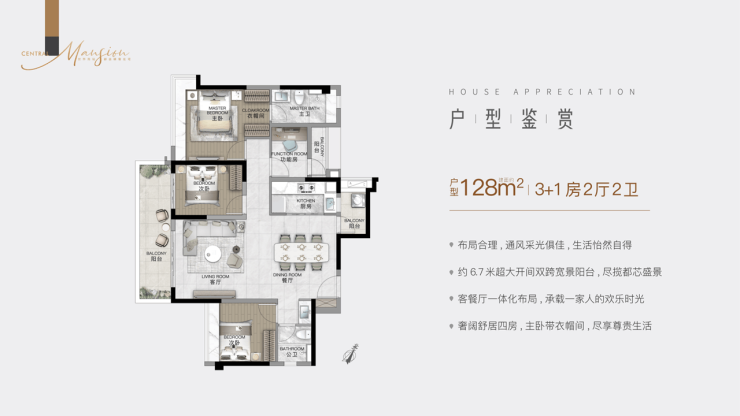 128㎡户型在空间舒适度上更进一步,双阳台对流设计,让室内空气循环通畅,畅享健康生活。多段式 LDKG 超长通厅,将客厅、餐厅、厨房、阳台连为一体,空间开阔通透,家人互动更方便。约 13.9m 的超大南向采光面,搭配超大方厅,让室内明亮又温暖,就算是阴雨天也无需开灯。