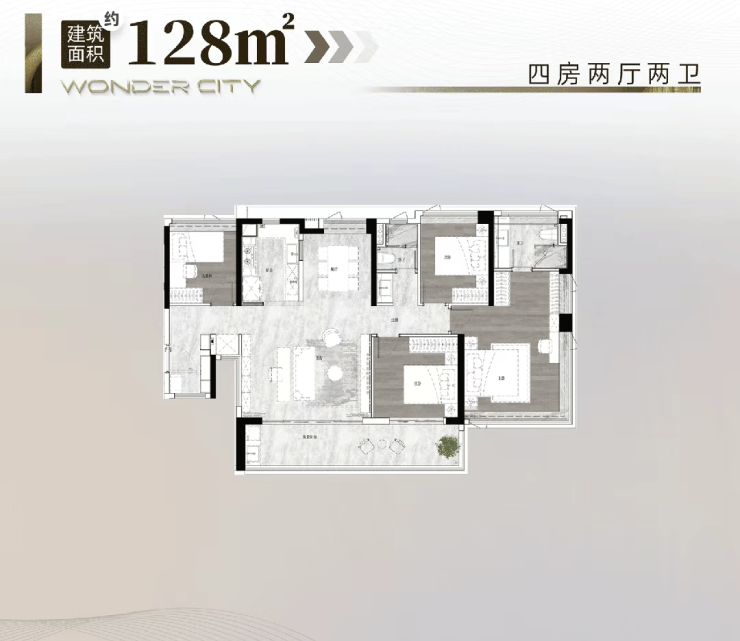 建面约128㎡四房两厅两卫户型,实现南北对流,超14m南向面宽让采光通风拉满;配备净宽5.05m巨幕宽厅、净宽4m奢阔主卧,还有8.65米IMAX阔景阳台,无遮挡欣赏低密墅景;主卧带270°全景飘窗和步入式奢阔衣帽间,提升居住的奢华感。二期户型全屋开创性地做到更高的飘窗拓展空间,将赠送面积化为可真正利用的“有效空间”,同时实现全屋空间均好性,每个卧室都有充盈尺度,全空间高配,每个空间都有开敞的景观面,全屋丰盈的收纳系统可承载全家人的需求。