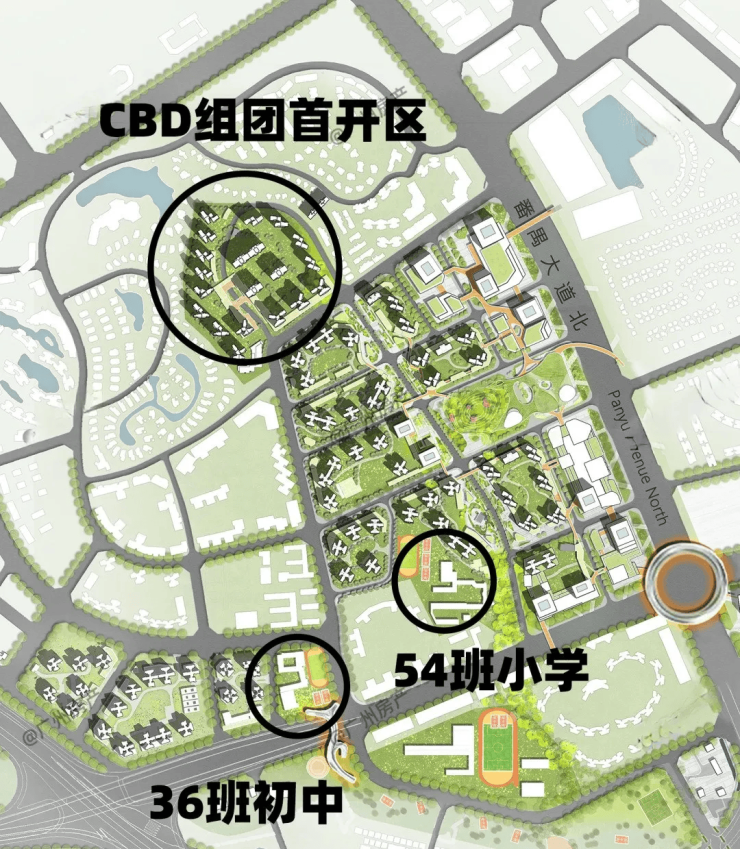 其中进度最快的为CBD组团内的54班小学及36班初中,54班小学为里仁洞小学原址改扩建,36班初中为越秀地产新建开学。目前,两所学校已官宣引入番广实验教育集团办学,由广大附中番禺实验学校具体管理,与越秀大学城和樾府配建的学校属同一教育体系,教学品质有保障。