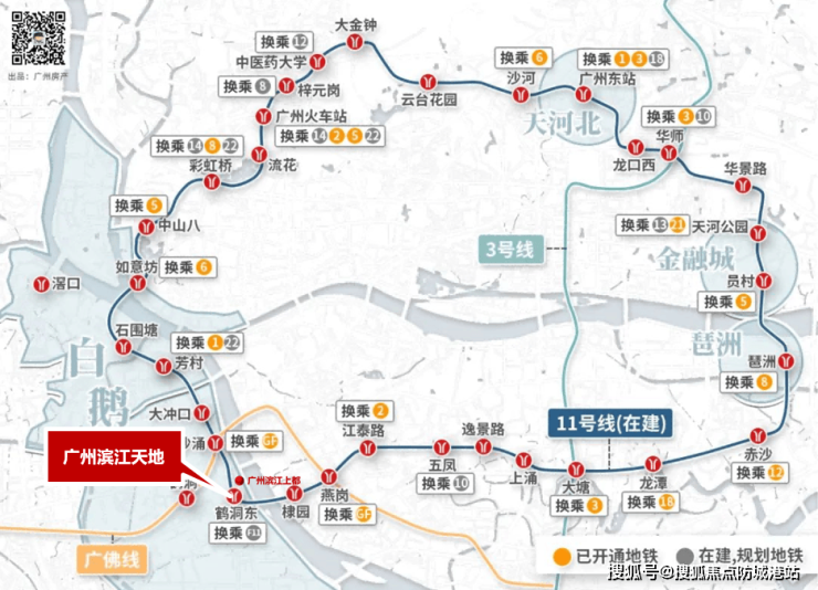 根据《广州市2025-2030国土空间规划》(穗府〔2025〕10号),白鹅潭板块定位为国际科创枢纽,规划面积达珠江新城的6倍,政府投资超200亿元打造滨江经济带。滨江天地距白鹅潭CBD核心仅2公里,地铁11号线鹤洞东站实测300米(2025年9月高德数据),3站直达琶洲会展区,6站接驳珠江新城,自驾经芳村大道15分钟达珠江新城,构建“半小时城央生活圈+1小时湾区生活圈”。