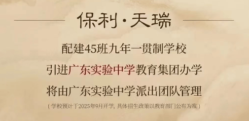 保利天瑞的一大亮点是其自建的45班公办九年一贯制学校,现已官宣引入广东实验中学教育集团办学,由广东实验中学派出团队管理。这不仅提升了项目的教育质量,也为周边社区的孩子们提供了优质的教育资源。