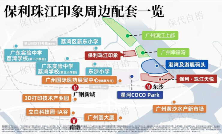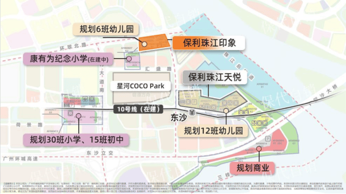 教育资源上,保利珠江印象也有不错的配置。自身配建 6 班幼儿园,方便孩子启蒙教育。保利还规划了 24 班的康有为纪念小学,为孩子的小学教育保驾护航。在 2km 范围内,有省实广钢校区第一小学部、省实广钢校区第二小学部、华师附小等优质小学;3km 内还有真光实验中学、东沙博雅实验学校等中学。虽然最终入学政策以教育局公布为准,但整体来看,周边教育资源较为丰富,能满足孩子不同阶段的教育需求。