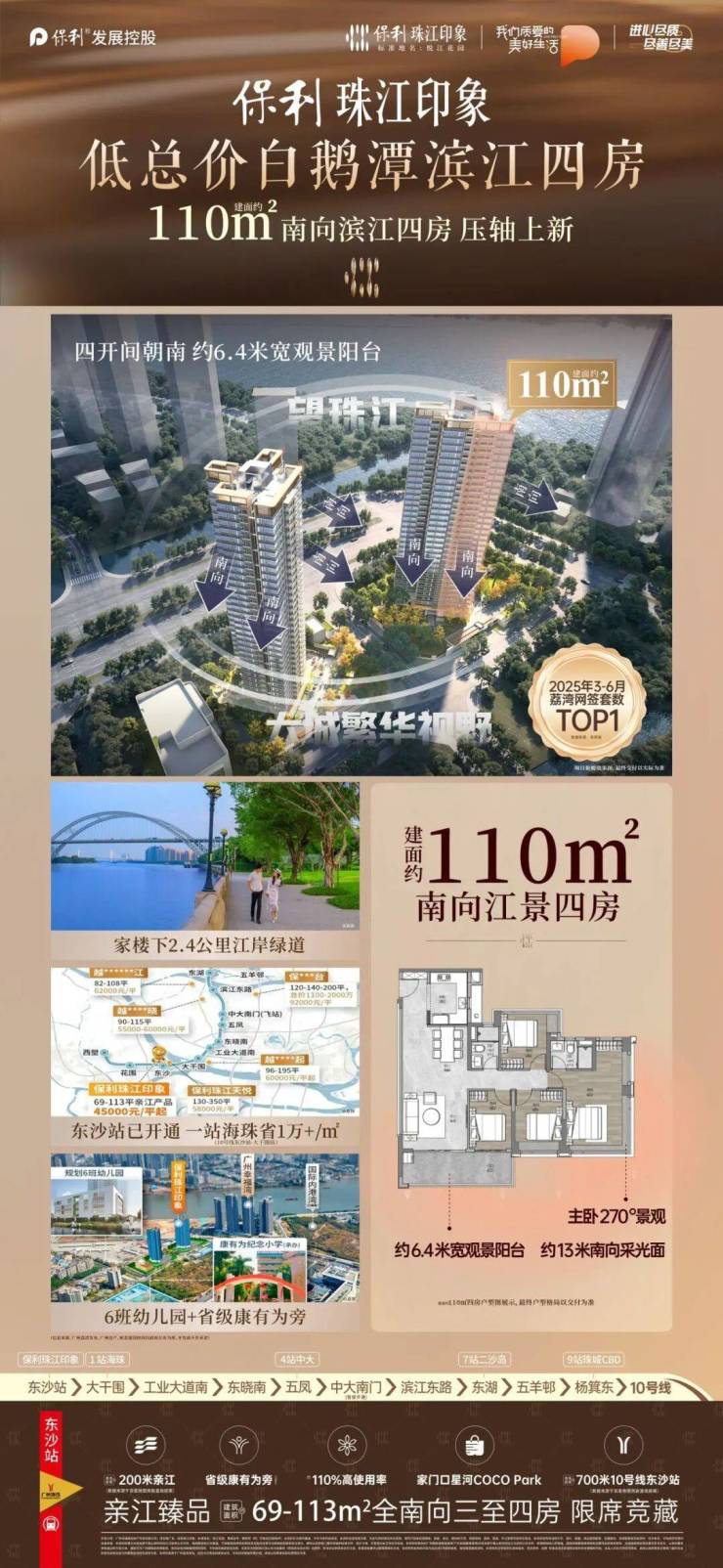 保利珠江印象凭啥能在楼市中脱颖而出?其实它的优势还真不少。首先,位置在白鹅潭经济带上,这可是五大世界级商圈之一,11 公里沿江总部经济带加速兑现,发展潜力巨大。项目占地约 1.56 万方,总建面约 2.9 万方,容积率仅 2.36 ,绿化率 35%,妥妥的高品质低密纯粹住区。产品多样,从 E1 栋 69 - 80 - 85㎡全南向户型,到 D1 栋 85 - 108 - 113㎡的选择,使用率高达 110% 。交通也方便,离 10 号线东沙站(预计 25 年开通)直线距离约 700m ,11 号环线(2024 年 12 月已开通)也不远。周边商业、教育配套逐步完善,虽然目前小区只剩大户型四房,但对于追求低密度环境、看好区域发展的购房者来说,不失为一个好选择。