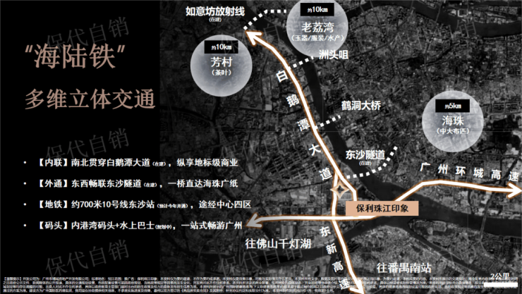 交通出行上,保利珠江印象有着明显的优势。从地铁来看,直线距离约 700m 处就是 10 号线东沙站(预计 25 年开通),开通后能零换乘直达珠城 CBD ,出行便利度大大提升;约 1.3km 处是已开通的 11 号环线,畅达中心五区不在话下。自驾的话,白鹅潭大道串联十公里沿江总部经济带,在建的东沙隧道以及环城高速,让前往海珠变得轻松。就连水上交通也有规划,内港湾码头 + 水上巴士(规划中),未来可以一站式畅游珠江,这种多元立体的交通网络,为业主的出行提供了多种选择。
