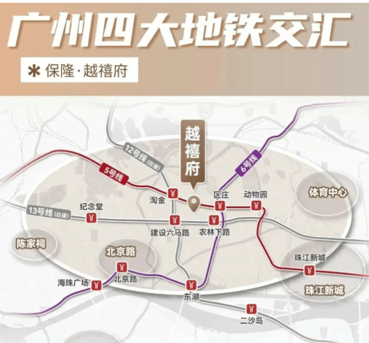 保隆越禧府坐落于越秀区先烈南路23号,地处广州传统豪宅板块——环市东核心腹地。这里不仅是省市机关单位、高端写字楼与国际酒店的聚集地,更是广府文化与现代都市交融的典范区域。项目紧邻执信中学本部,步行约500米即达地铁5号线与6号线交汇的区庄站,未来还将被12号线淘金站、13号线农林下路站(预计2025年底开通)环绕,形成罕见的“四地铁交汇”格局,通勤效率极高。
