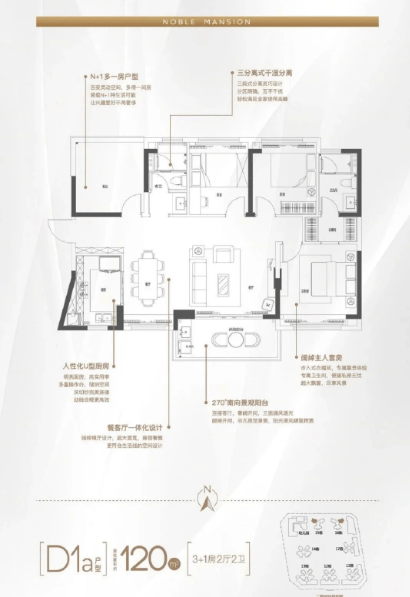 120-121㎡三房两厅两卫作为大户型代表,空间尺度更为宽松,适合追求舒适居住体验的家庭,目前二期D1a户型持续在售,精装交付省去后期装修麻烦。这款户型客厅开间宽敞,活动空间充足,家人可以在这里尽情玩耍、互动;主卧配备独立卫浴与衣帽间,满足了主人对品质生活的追求,衣帽间可以收纳衣物、配饰,让卧室更加整洁有序。每个房间都有充足的采光面,搭配超大阳台,观景、休闲都十分惬意。精装交付标准严格,选用优质建材与家电,入住即可享受品质生活,无需为装修费心费力。