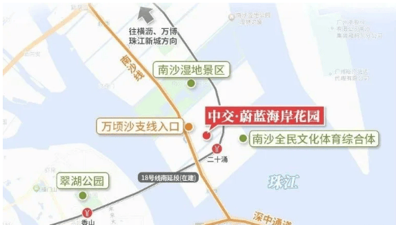中交・蔚蓝海岸交通优势显著。距离已通车的深中通道南沙线收费站仅约 1 公里,驱车半小时可达深圳前海,加强了与深圳这一经济强市的联系。距离在建的 18 号线南延线(南中城际)二十涌站约 500 米,该线路设计时速达 160 公里 / 小时,西线预计 2027 年通至中山市区,东线计划 2030 年直抵珠海拱北口岸。此外,还有深南中城际将在二十涌站南侧设站。未来这里将成为大湾区重要交通枢纽,实现半小时内畅达广州、深圳、中山、珠海,为居民的商务出行与生活出行提供极大便利。
