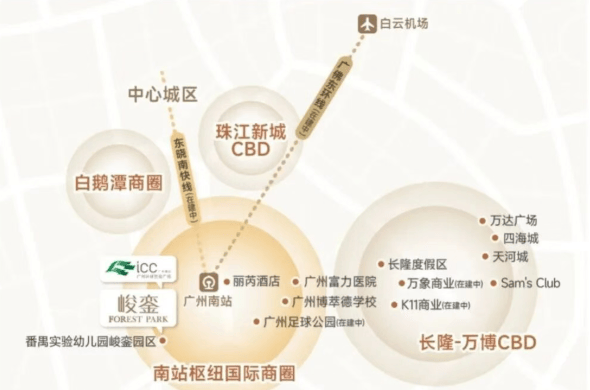 项目距离地铁2号线广州南站仅600米,地处广州南站TOD核心区域,该区域汇聚了4高铁、4城际和4地铁共12条轨道交通线路,实现了与大湾区及其他省会城市的无缝连接。周边配套设施齐全,包括幼儿园、小学、中学在内的教育资源以及多种商业娱乐设施,满足居民日常生活需求。