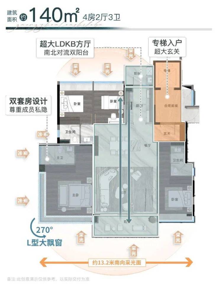 3、窗地比高达38%,主卧设置270°大飘窗。