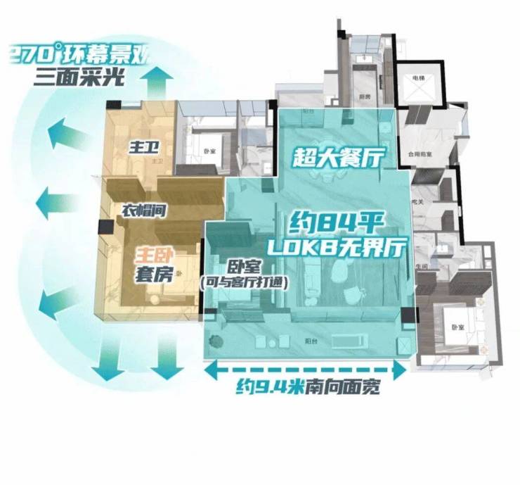 约 17 米的南向面宽,让整个户型充分沐浴在阳光之下。全屋超高窗地比,保证了室内充足的采光与开阔的视野,站在室内仿佛与自然亲密接触。全南向功能房,无论是卧室还是书房,都能享受阳光的温暖与美景的陪伴。主套约 270 度 IMAX 级环幕视野,宛如将一幅自然画卷铺展在眼前,不仅能欣赏到社区园林的美景,还能远眺周边的山水风光,让居住成为一种享受。