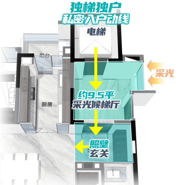 2梯2户设计,两条梯腿楼栋并列分局,电梯位于核心筒中间,业主从电梯出来后,往两个不同方向回家,互不干扰,相当于1梯1户。