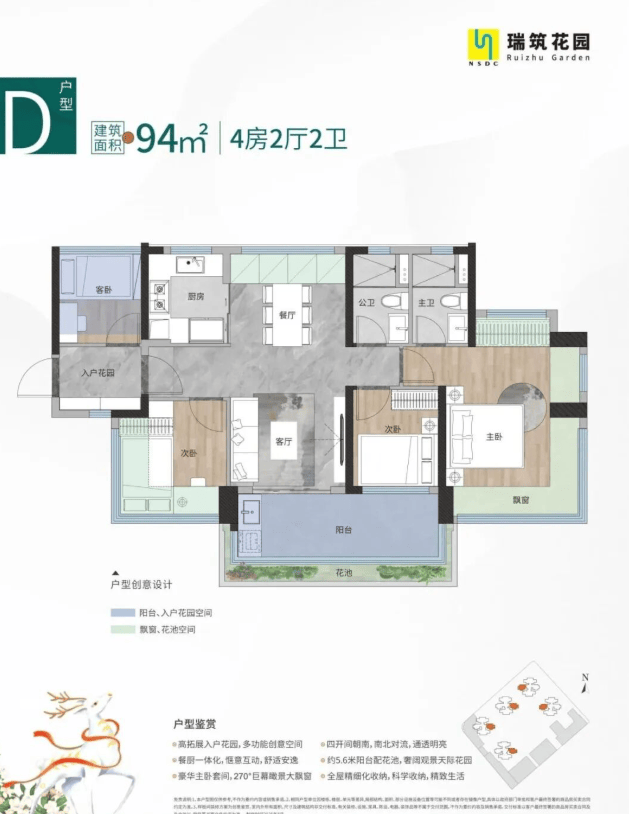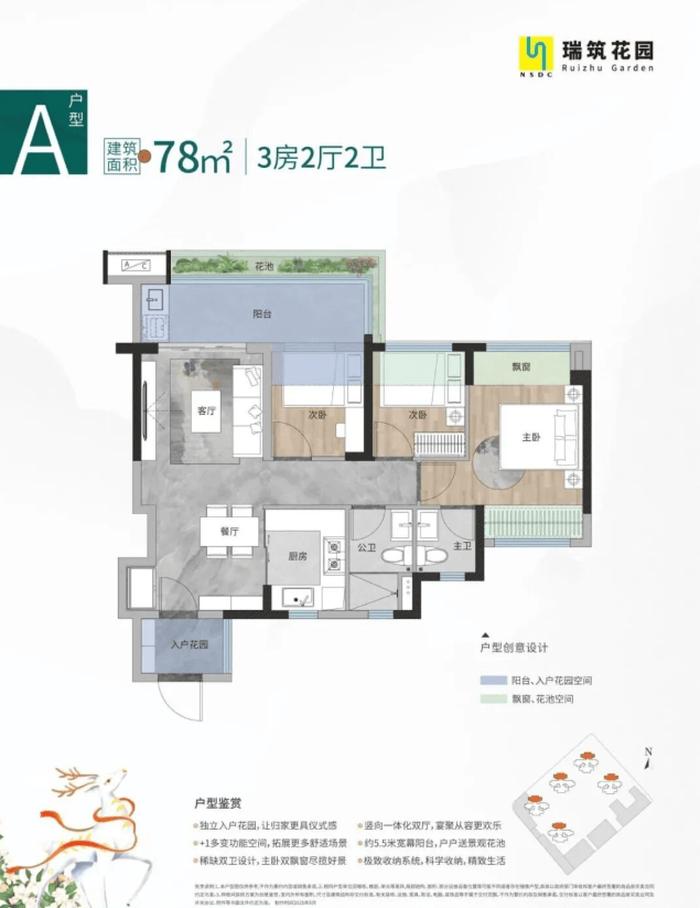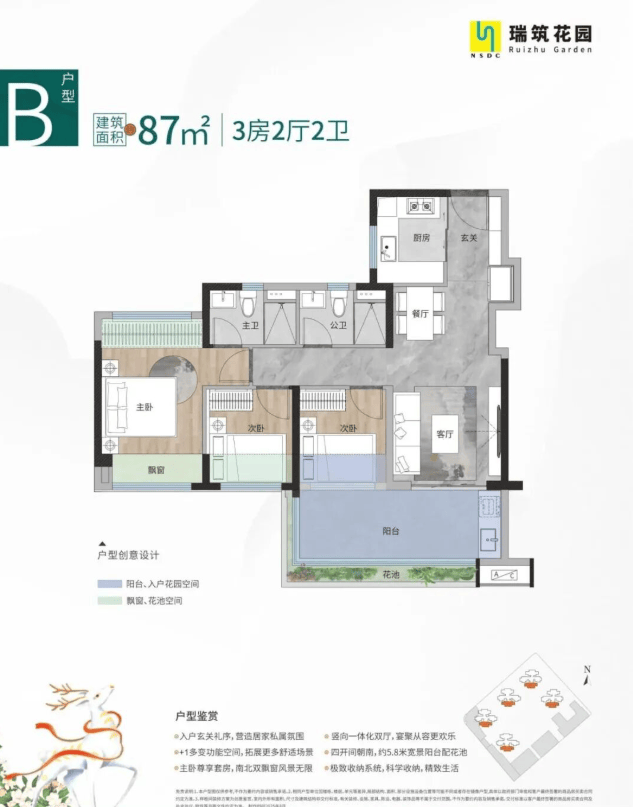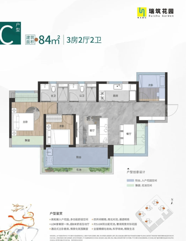 主力户型实用率超100%,部分户型带有独立入户花园和宽景阳台,提高了居住体验。