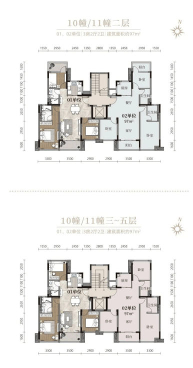 南区:共12栋32层高层住宅(其中11栋和12栋自持不对外销售),整体布局围合式,所有单位朝南,实现全明采光。主力户型包括: