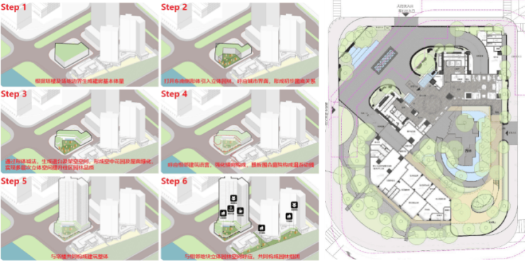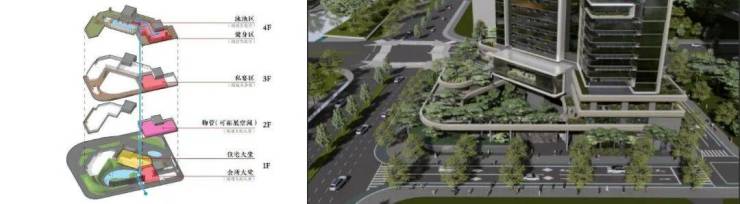 规划上采用超级底盘的形式,将公建配套叠在4层以下,将住宅放置在5层以上,同时通过连廊和屋顶将不同楼层的配套联系起来,形成了立体游园动线;平面上通过塔楼将庭院分为前庭和后院,前庭设置环岛落客区,后院置入山水景观实现业主休闲需求。