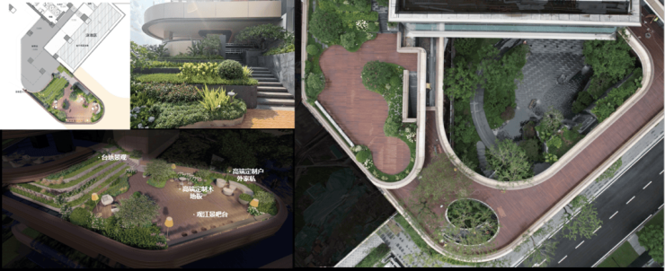 【十景山水立体游园】景观设计借用连廊、屋顶等空间,结合归家动线和休闲动线,打造立体游园,在园林中置入山水节点。