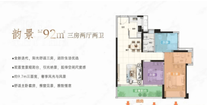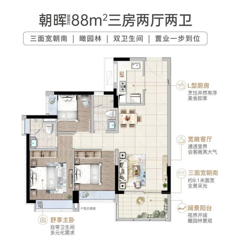 建面约88平方米三房两厅两卫:作为入门级改善户型,实现了“3+1”的灵动空间布局。三开间朝南,连接约6.1米宽的景观阳台,视野开阔。主卧套房设计,配备独立卫浴,实用率高,总价门槛相对亲民(总价199万起),适合首改家庭或注重性价比的购房者。