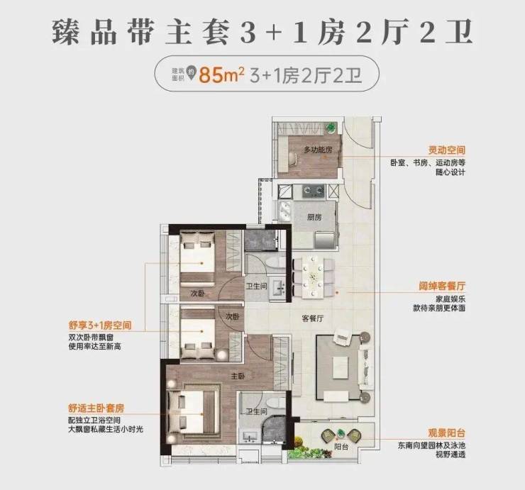 85平方米的“3+1”四房户型是项目的主力户型之一,均价约为每平方米4.3万元。东南朝向的布局,使得室内采光更加充足,清晨的阳光能洒满整个房间。该户型不仅能看到美丽的园林景色和星空泳池,还额外增加了一个灵动空间。这个多出来的房间可以根据家庭需求灵活改造,既可以作为书房供主人办公学习,也可以改为儿童房供孩子居住,甚至可以作为老人的临时客房。主卧配备了独立卫浴和8平方米的步入式衣帽间,储物空间充足,满足女主人的收纳需求。当家里有老人帮忙带孩子时,这种多房间的布局能让三代同堂的家庭成员互不打扰,既亲密又独立,营造出和谐的家庭氛围。