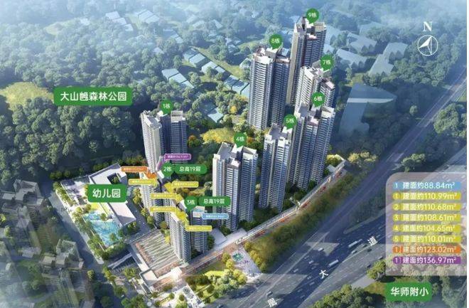 这楼盘基础配套相当出色。9 栋楼错落有致,分两期开发。小区绿化率约 30% ,内部打造超 6000㎡山体公园及 350 米林荫链山跑道,环境宜人。1336 个车位,1:1.17 的车位配比,停车不愁。