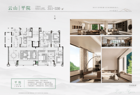 观山叠院户型则分为上下两层,下叠庭院入户,上叠星空露台,南北对流通风良好,建筑面积从294至634㎡不等,适合不同家庭结构的需求。