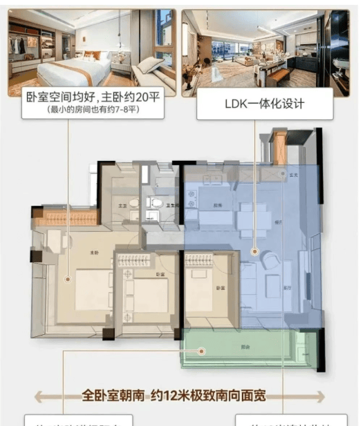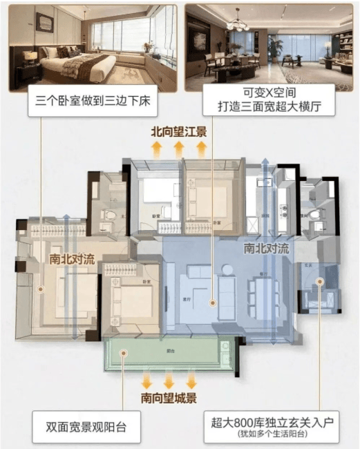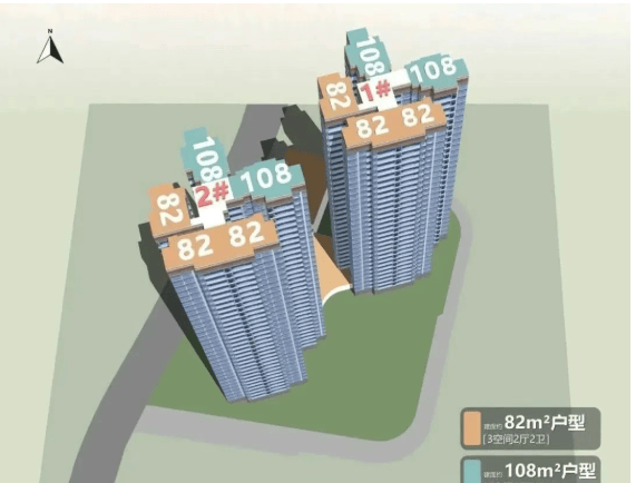 项目提供两种主要户型:82平方米三房两厅两卫及108平方米四房两厅两卫。所有卧室均为南向设计,客厅和卧室朝南,厨房和卫生间则位于北侧,保证了室内采光充足。尤其是108平方米户型,交付时的大横厅设计可通过打通次卧变身为三面宽超级横厅,提供了多样化的空间使用方式。