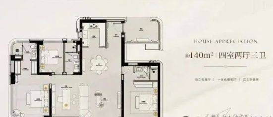 140㎡四房:南向四开间,阳台面宽7.2米(对比周边项目5米面宽,景观面提升40%),中西双厨设计,次卧可分合为工作室,总价约1395万元起。