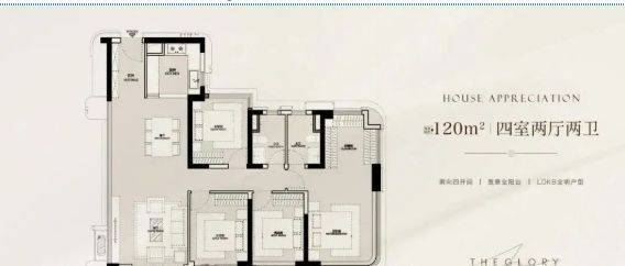 120㎡四房:LDKB一体化设计,270°弧形落地窗,主卧套间带独立衣帽间,实际使用率超105%,总价约1140万元起。