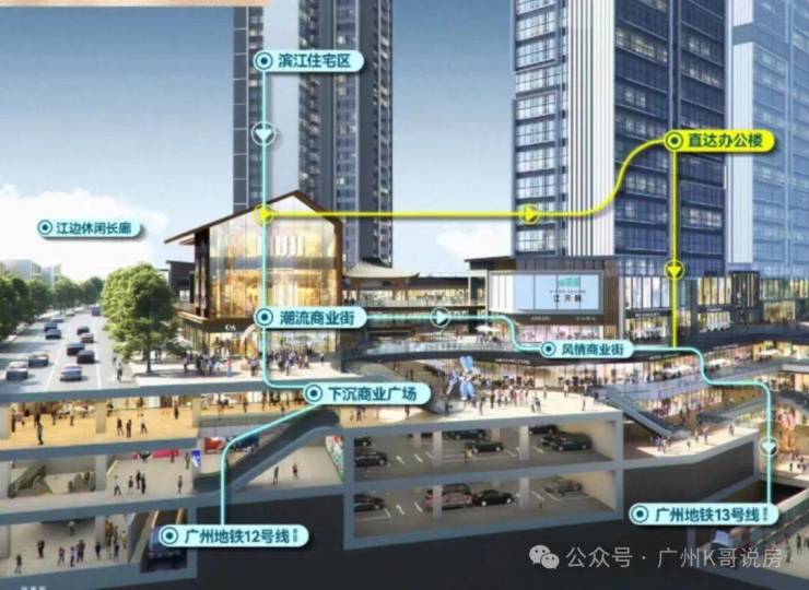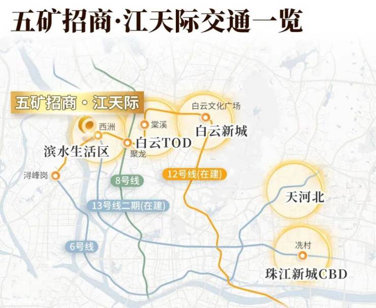 A3:五矿・招商・江天际作为三地铁交汇的 TOD 项目,其交通优势为业主带来的实际便利是全维度的。首先,是地铁出行的极致便捷性,项目为真正的地铁上盖,地下空间与槎头地铁站直接连通,业主从家出发可直达地铁站,无需直面户外天气变化,无惧风吹日晒雨淋,实现了全天候的便捷地铁出行;其次,是通达全城的线路覆盖,项目坐拥的 12 号线、13 号线二期两条已通车与即将通车的地铁线路,串联了白云、荔湾、越秀、天河、海珠、番禺六大行政区,4 站直达荔湾、6 站直达纪念堂,无需换乘即可直达珠江新城、白云新城、二沙岛、大学城等核心板块,无论是日常通勤、商务出行还是休闲游玩,均可通过地铁快速通达;第三,是广佛同城的双城联动,规划中的佛山 8 号线止于槎头站,未来通车后,业主可通过地铁快速通达佛山中心城区,实现广佛双城生活的自由切换;第四,是陆路交通的高效联动,项目毗邻白云二线、棠槎路两条城市快速路,通车后 5 分钟直达白云站 TOD,10 分钟直达白云新城,配合周边高速路网,可全面满足业主自驾出行的多元需求,无论是日常通勤还是跨城出行,均能实现高效通达。