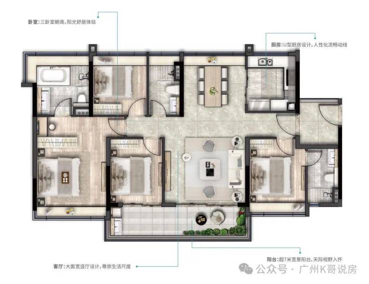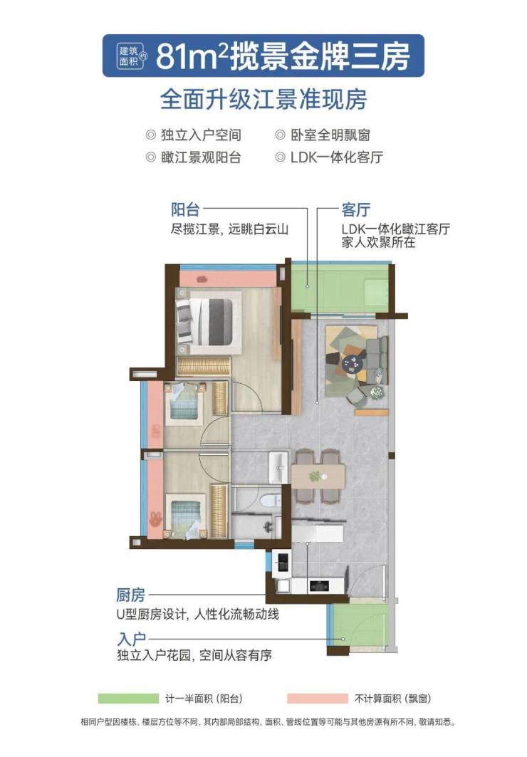 建面约 78㎡的三室两厅一卫户型,为刚需客群打造了高性价比的滨江人居选择,户型赠送入户花园,实现了超 94% 的高实用率,空间利用率拉满。户型采用 U 型厨房设计,宽尺实用,操作动线流畅;主卫采用干湿分离设计,大幅提升使用效率;卧室均配备全明飘窗,拓展了室内空间与景观视野,最高可实现三卧瞰江,是广州市场上罕见的可实现多空间瞰江的江景小三房户型,以极小的面积门槛,为购房者实现了一线江景的居住体验。