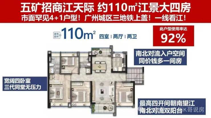 建面约 110㎡的四室两厅两卫户型,为改善型客群打造了全明通透的滨江四房产品,户型赠送入户花园,实用率接近 99%,空间利用率达到行业领先水平。户型采用南北双阳台设计,实现了南北通透的通风采光效果,江景尽收眼底;四开间朝南设计,三卧室南向瞰江,最大化保障了室内的采光面与景观面;U 型厨房设计,带来了流畅的烹饪操作动线;主卫采用干湿分离设计,宽尺主套配备独立卫浴与衣帽间,保障了居家生活的私密性与舒适度,可全面满足三代同堂的居住需求。