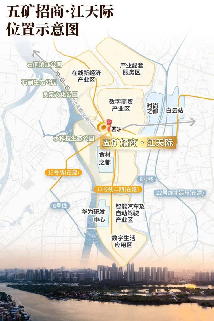五矿・招商・江天际坐落于广州白云区广海路以西,地处槎头 TOD 一期核心地块,是湾区新岸(罗冲围)片区内的标杆 TOD 人居项目。整个槎头站综合体片区总开发建筑面积超 300 万㎡,共分三期开发,其中槎头站场综合体与五矿・招商・江天际为一期、石井水泥厂收储地块为二期、槎头车辆段综合体项目为三期,未来将打造超越广船、广纸规模的大体量沿江宜居新城,而五矿・招商・江天际作为片区首发住宅项目,率先承接片区发展红利。