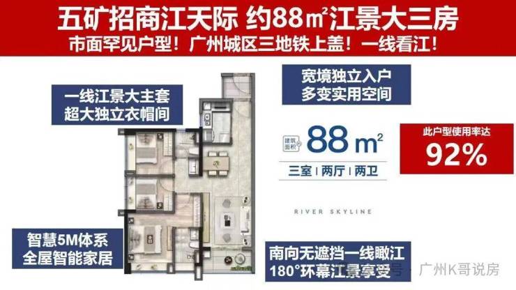 建面约 88㎡的三室两厅两卫户型,是刚改客群的优选户型,户型赠送入户花园,实用率超 92%,整体空间布局科学合理,无浪费空间。户型采用宽尺主套设计,预留了独立衣帽间空间,保障了主人房的私密性与舒适度;主卫与公卫均采用干湿分离设计,提升了居家使用的便捷度;卧室均配备全明飘窗,南向直面珠江江景,最高可实现 270° 瞰江视野,将江景资源最大化引入室内,在有限的空间内,实现了功能、舒适度与景观体验的全面兼顾。