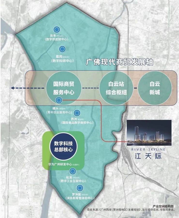 在广州 “西联” 发展战略与广佛同城化的持续推进下,湾区新岸(罗冲围)片区作为广州西部连接佛山的门户节点,将承接广州中心城区的功能外溢,同时享受广佛同城化带来的发展红利。片区内的槎头 TOD 作为三地铁交汇的轨道交通枢纽,将成为广佛同城化的重要交通节点,进一步强化片区的交通优势与人口集聚能力。而五矿・招商・江天际作为片区内首发的标杆住宅项目,将率先承接片区城市更新、产业升级、交通完善带来的多重发展红利,成为广州西部滨江人居的标杆作品。