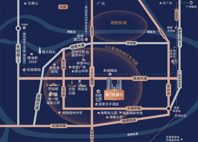 顺控桂樾台坐落于佛山顺德容桂街道核心区域,具体位置为容桂街道文海中路12号(原容桂客运站东侧),地处容桂中轴核心区,是容桂老城区与新城区的衔接枢纽,地理位置得天独厚,既坐拥老城区的成熟烟火气,又能享受新城区的发展红利,周边交通、教育、商业、医疗、生态等配套醇熟,步行可达范围内即可满足日常所有生活需求,地理位置的优越性,进一步凸显了项目的稀缺价值与居住便捷度。