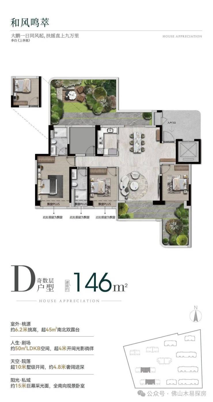 项目最大的户型亮点的是约130%的超高实用率,得益于新规优化与赠送空间的合理利用,项目的实际使用率远超建筑面积,让购房者获得远超预期的居住体验。以146㎡户型为例,其实际使用感接近传统180㎡的产品,极大地提升了空间的利用率,让业主花更少的钱,享受更大的居住空间。同时,项目每一户都配备了6.2米挑高、4米多宽度的空中大露台,采用上下楼错开设计,不仅提升了采光和通风效果,还为业主提供了私属的户外空间,可用于种植、休憩、社交等多种场景,真正实现了“空中有庭院,生活有诗意”的居住体验。
