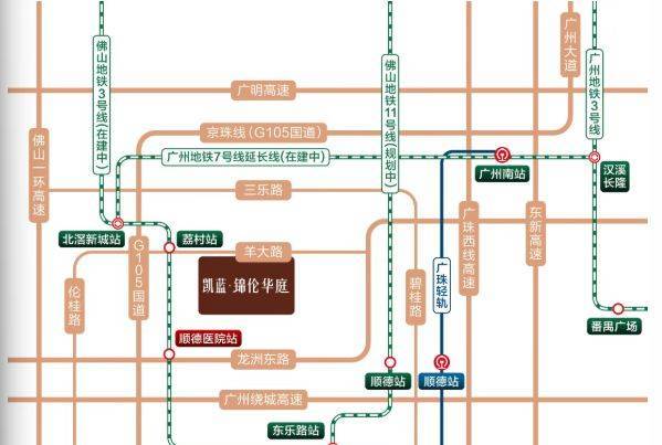 凯蓝锦伦华庭地处顺德东部新城北部居住区,距离佛山地铁3号线“顺德人民医院”站仅约400米,步行即可到达。该地铁线已正式通车,通过与广州地铁7号线无缝对接,11站直达广州南站,极大地方便了居民的日常出行。此外,项目周边还有广珠城轨和广佛环线等多条轨道交通线路,进一步提升了区域的交通便利性。