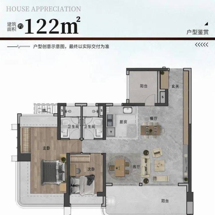 建面122㎡四房,南向宽景阳台约6.6米,比142㎡的宽景阳台还长,270°环幕瞰景主卧,奢侈的不能再奢侈~