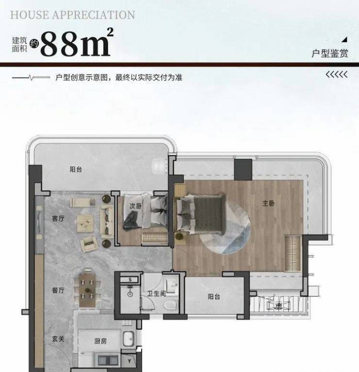建面88㎡三房,LDKB一体化设计,约5.7米的宽景阳台,另外还有270°的环幕主卧。