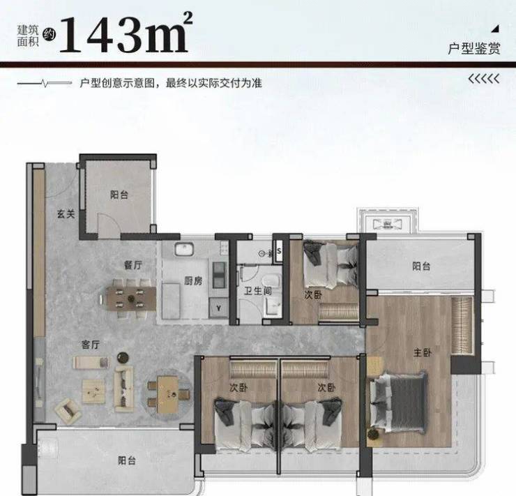 建面143㎡五房,四开间朝南设计,约36.5米的采光面,视野景观一流,而且大阳台以及大飘窗都是标配。