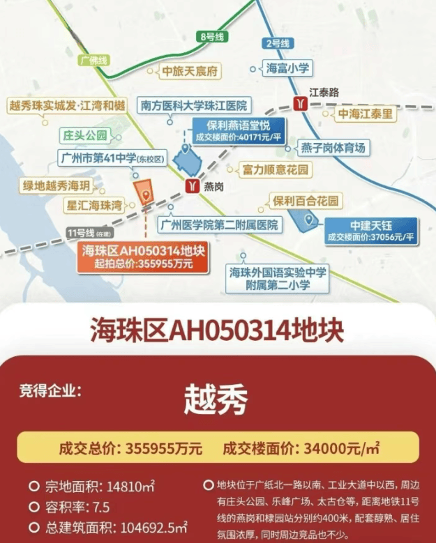 在广州主城海珠的发展版图上,广纸板块始终是承载城市更新与品质居住的核心阵地。从 2015 年启动开发至今,这片承载着老广工业记忆与时代新生的区域,早已完成从旧厂片区到宜居新城的华丽蜕变,连片成熟社区、完善商业配套、生态公园绿地交织,勾勒出体面又鲜活的城市面貌。2025 年 9 月 19 日,越秀地产以总价 35.6 亿元、楼面价 3.4 万元 /㎡成功摘得广纸 314 优质地块,凭借精准的板块布局与深厚的产品打造功力,匠造越秀・熙悦江湾这一主城改善力作。项目占地面积约 1.5 万㎡,出让面积 13959㎡,总建筑面积约 10.5 万㎡,虽体量精巧却承载着越秀对广府人居的极致理解,背靠 56 万方越秀・星汇海珠湾十年成熟大盘,共享全维度醇熟配套,更以新规之下高达 120% 的户型使用率,成为海珠西乃至广州主城改善市场的 “卷王” 产品。