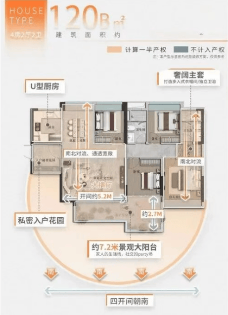B户型:横厅设计+唯一带入户花园,四房尺度均衡,实用性极强;